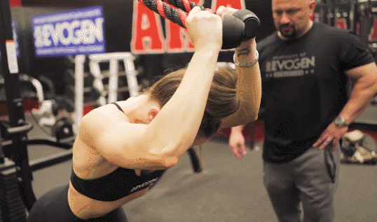 这个动作同样使用龙门架和绳索进行训练,2.5KG的重量配合背向俯身的动作,将绳索放在脑后,由后至前进行臂屈伸拉动。
